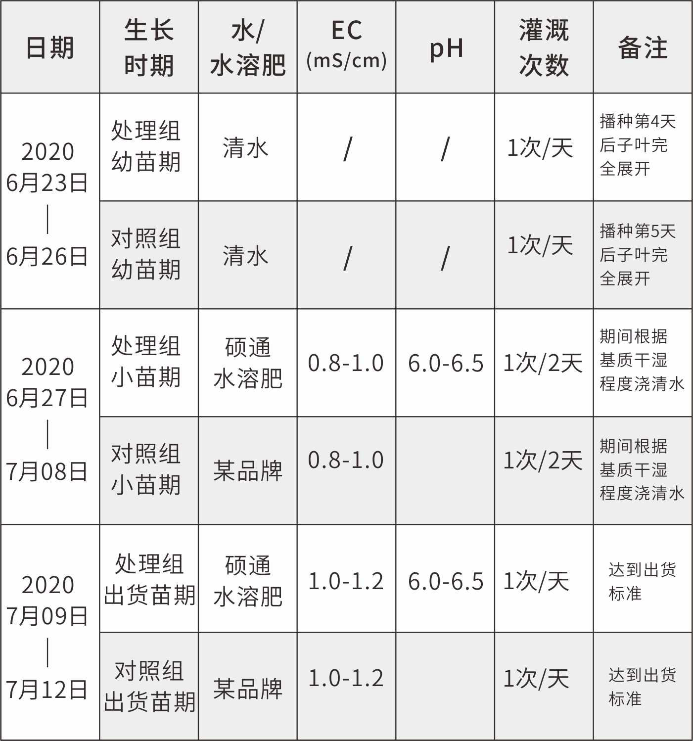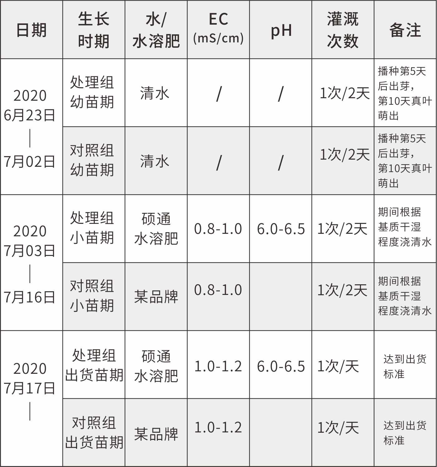 种子出苗温度适宜在 25- 30 ℃ 左右,出苗后温度适宜在 25-28℃左右,基质保持湿润。试验布点完成后,我司技术员进行日常管理,出苗后每天浇一次清水。当真叶萌出时,可以使用营养液,800-1000倍浇灌,间隔2天/次,期间天气导致基质过干适当补充清水,保证基质良好的环境供苗正常生长。实验过程中,病虫害的防治与基地同步。每天记录穴盘苗的生长情况,根据长势再进行细微的调整。