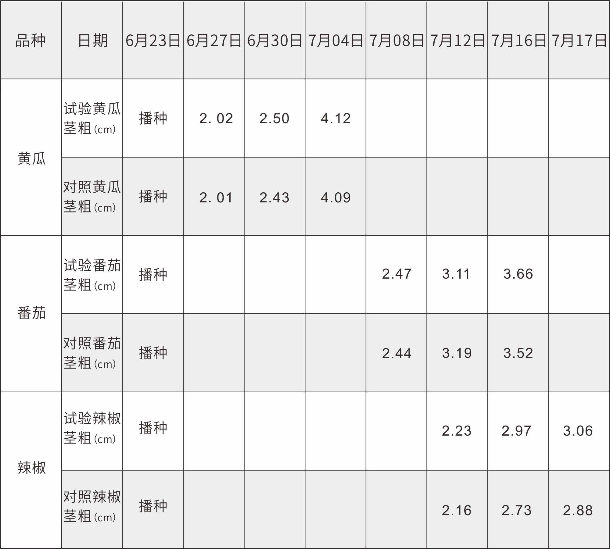 在6月27号开始就对各试验点的株高和茎粗进行数据采集,数据为多个试验基地的平均值。发现试验组的整体出芽率高、叶片颜色更绿。子叶变绿后,保持土壤湿润。幼苗旺盛生长期温度不能过高,控温控水,可防止幼苗徒长,并根据苗的长势进行药物压苗防止徒长。
